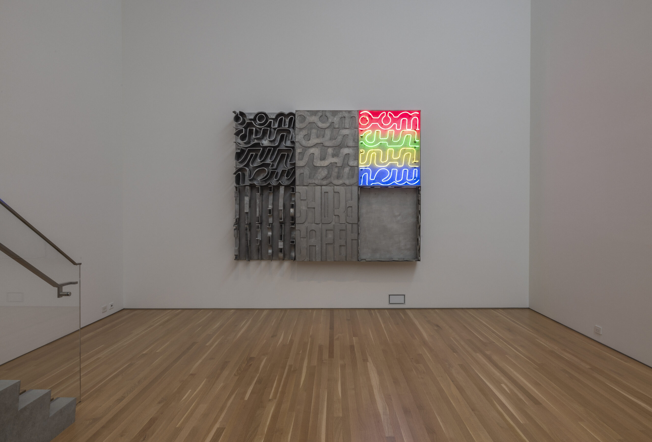 Chryssa viewed the urban landscape as a bright new world of artistic possibilities. For her, sculpture’s past was tied to the heavy origins of Western art and its foundation in ancient Greece. Upon arriving in New York, she found liberation from her idea of art’s historic past by utilizing the city’s array of industrial refuse— like neon tubing, stainless steel, lead, and metal— in novel ways. Following WWII, New York City was donned the “crossroads of the world” and was becoming an electrical environment of industry and consumption. Chryssa embraced the way pulsing, bright lights, metal signage, and language from advertising dominated the city. The perpetual flashing lights of New York City are thus expressed through Chryssa’s use of flashing, colorful neon letters in the upper right-most quadrant of Americanoom.