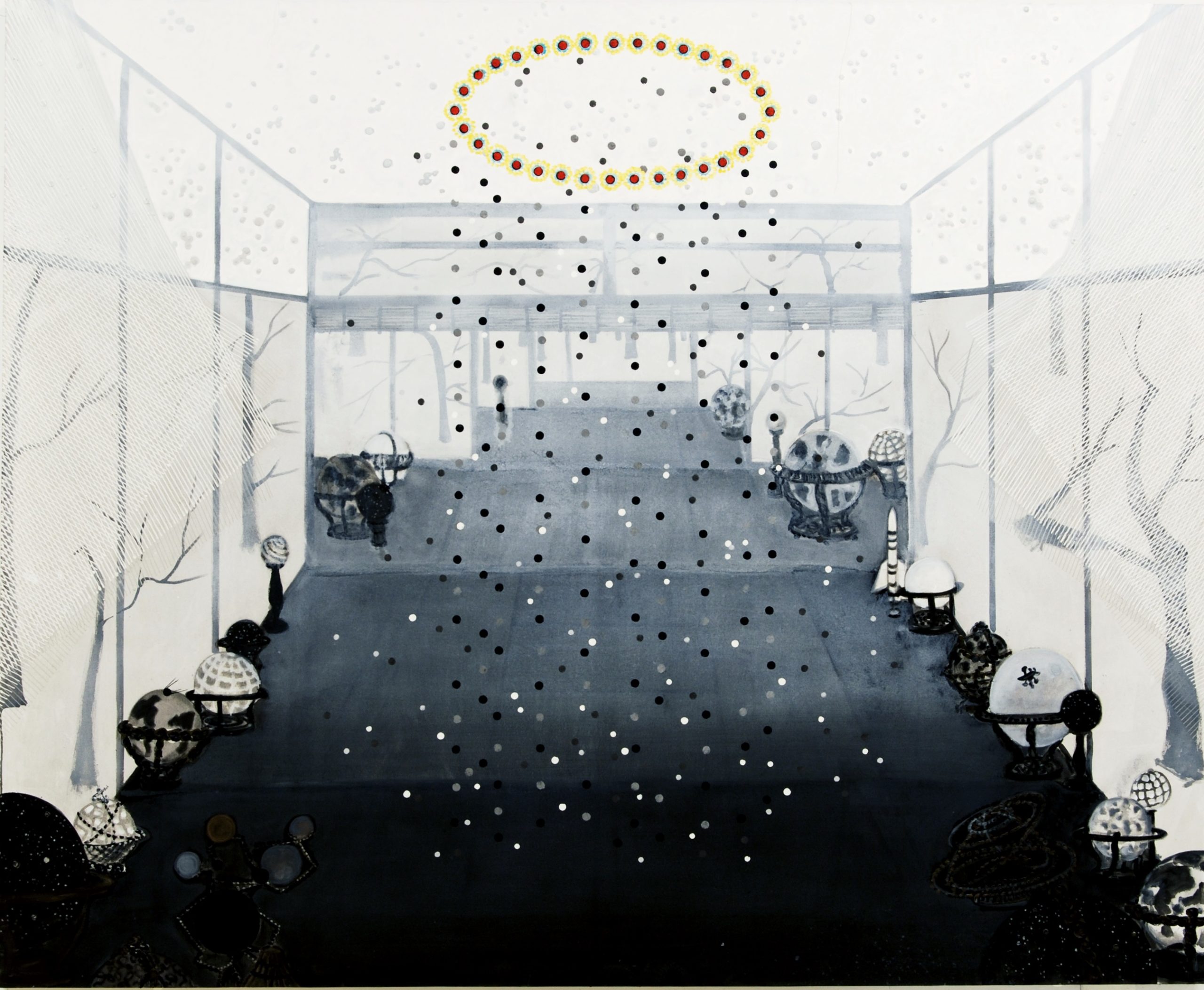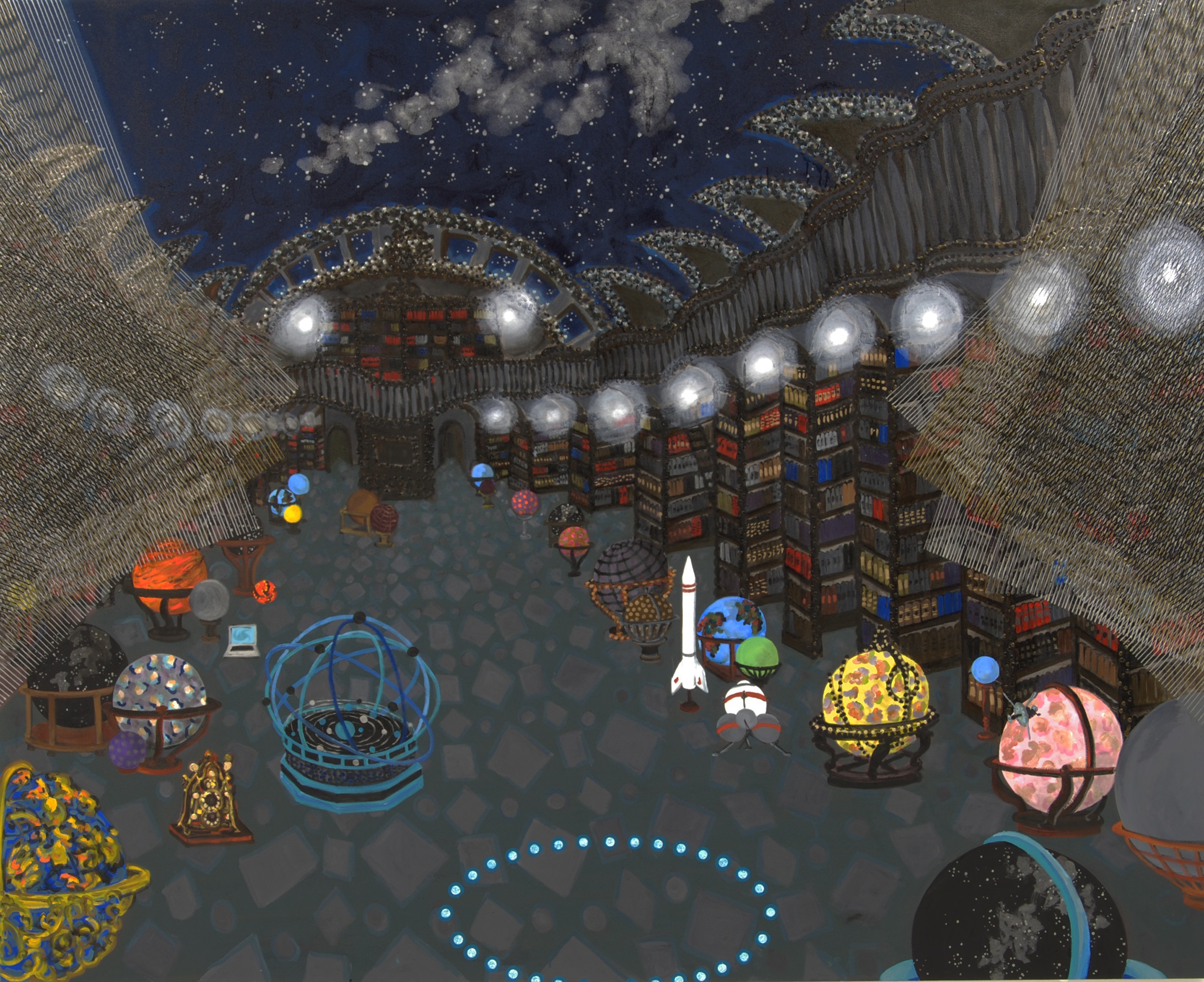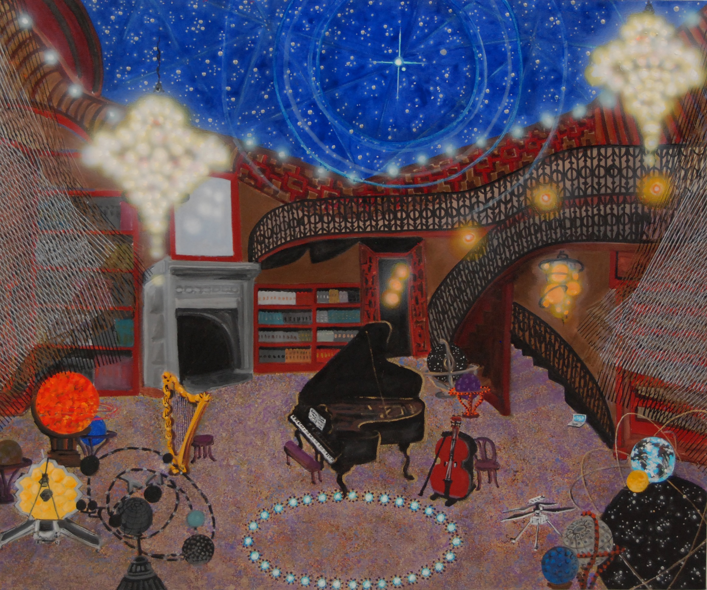Itatani’s oversized paintings—often seven-by-eight feet or even larger—burst with an energy created by densely placed images, which serve as symbols of humanity’s eternal search for knowledge. Many of the painting depict “stages” where science and culture come improbably together: baroque bookcases with rockets, grand pianos and Japanese tea rooms, harps alongside helical staircases, and atomic models of electrons charging around nuclei. The effect is of an artist’s joyous exuberance and her wonder and awe at the world and beyond.