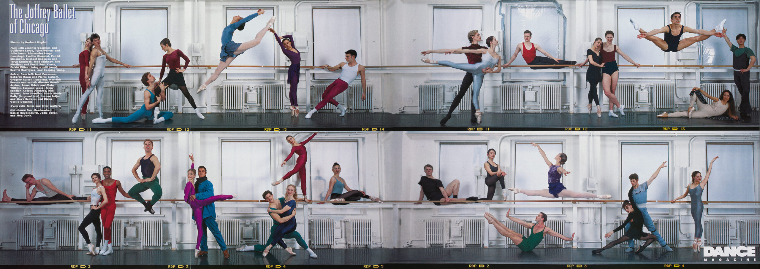 The Joffrey Ballet Company, 1996. Adapted from a Dance Magazine design which originally appeared in the May 1996 issue of Dance Magazine. Reproduced with permission from Dance Magazine. Photograph by Herbert Migdoll © Joffrey Ballet. Jerome Robbins Dance Division, The New York Public Library for the Performing Arts.