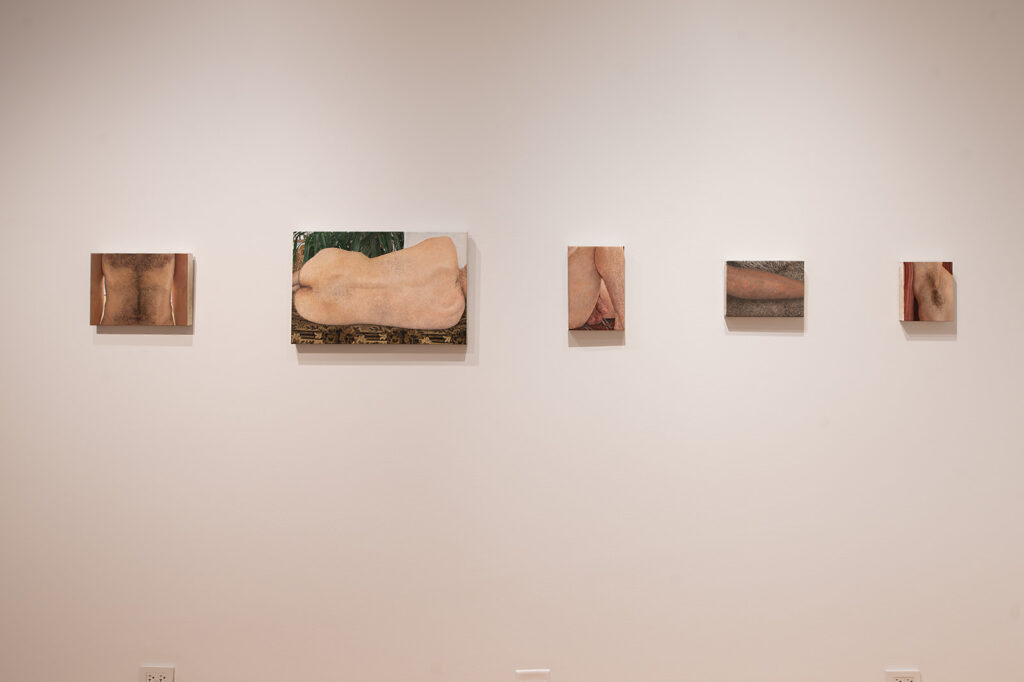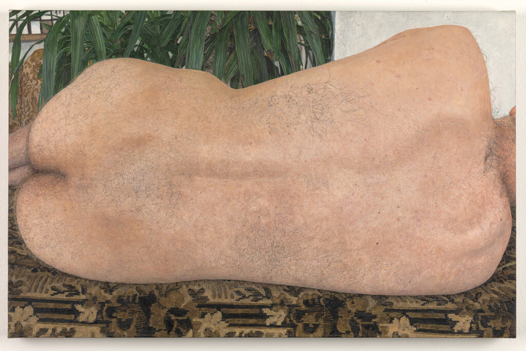 In viewing these paintings, we adopt Altfest’s gaze, only to find her subjects unable to return it. In Head and Plant, the model’s face is obscured by rugged vertical streams of cacti; in Torso and The Back, the models are beheaded entirely by the canvas’ crop. Deprived of facial cues, our habitual search for emotion through glossy eyes or the curve of a lip is interrupted. This occlusion compels us to look elsewhere: to the texture of skin, the rhythm of body hair, or the dialogue between flesh and spiny plant. The nude body, long the object of erotic conquest in art history, is reoriented within a wider ecology of forms. Pale bluish veins course with the same life force as outstretched roots, and a hairy chest echoes the wiry chaos of tumbleweed.