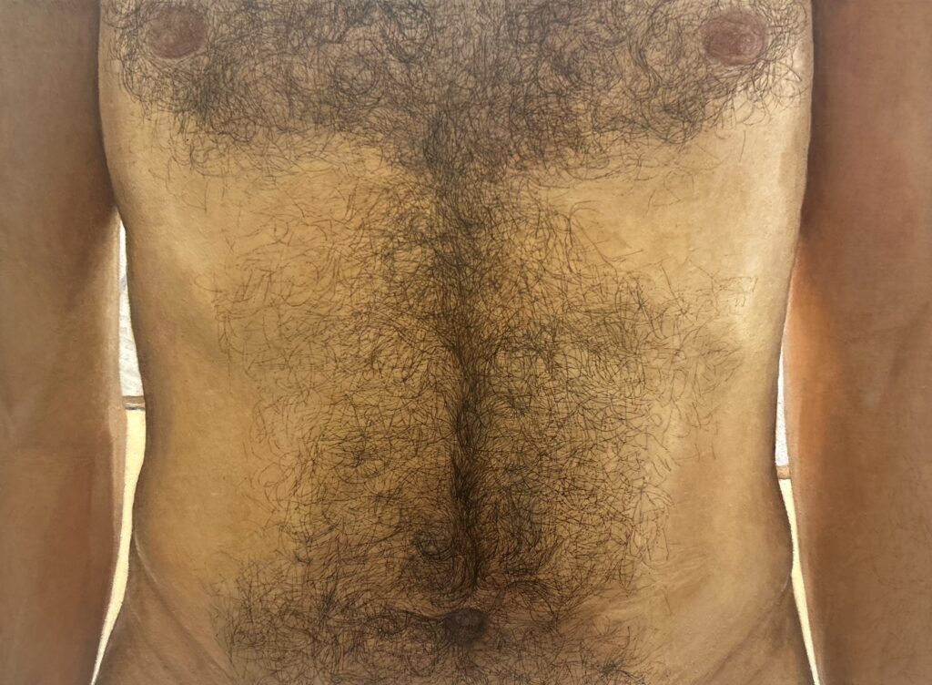 While some have linked Altfest’s work to the “female gaze,” a supposed reversal of the objectifying male gaze, her motivation for painting men resists such categorization, even as an acute awareness and manipulation of looking pervade her paintings.(3) In Torso, for instance, the model stands naked with his arms at his side as Altfest rakes each inch of flesh, recording every hair, crease, and blemish—from sullen nipples pointing askew to a belly button sunken beneath a whirlpool of hair. The resulting image is charged with the intensity of prolonged observation.