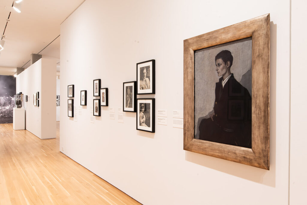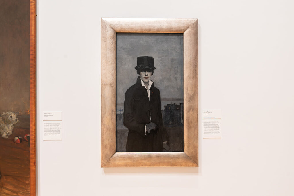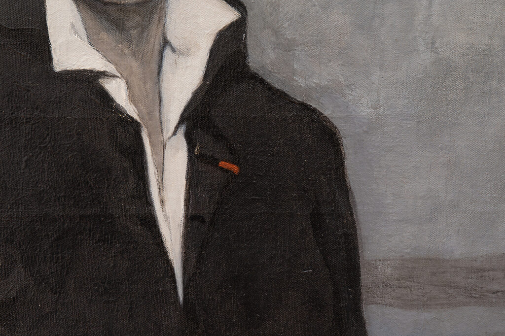 A mystical aura surrounds the decidedly androgynous figure in the minimal outfit. In this sea of grey, two specks of red stand out: a hint of rouge on Brooks’ lips and the crimson on her lapel – a Legion of Honor awarded by the French government for her art (3). Brooks appears keen to clearly outline her accomplishments instead of her gender. The wardrobe choice and eerie color palette release the centrality of gender in the painting and what remains is the essence of the person- a captivating, otherworldly existence.