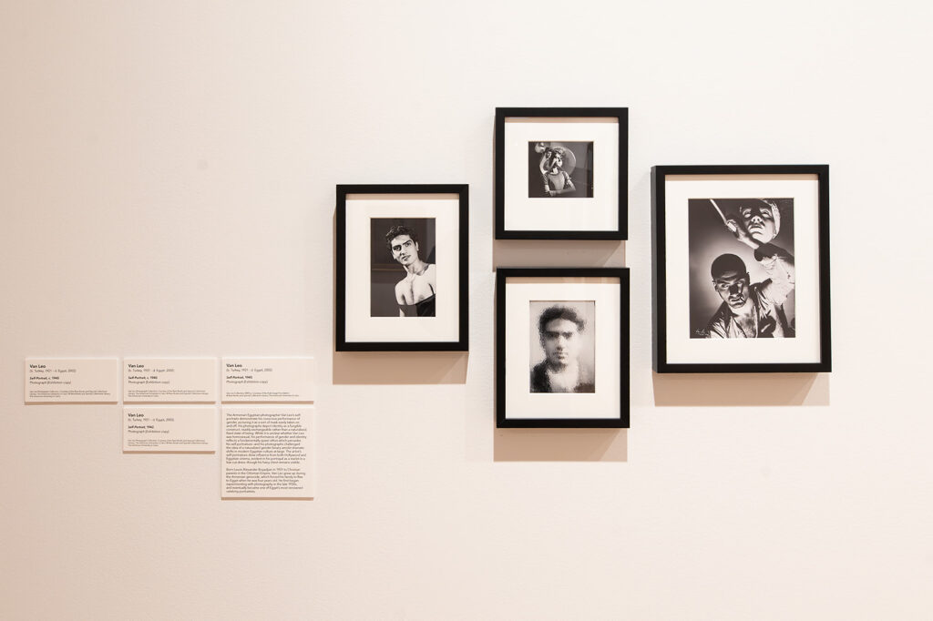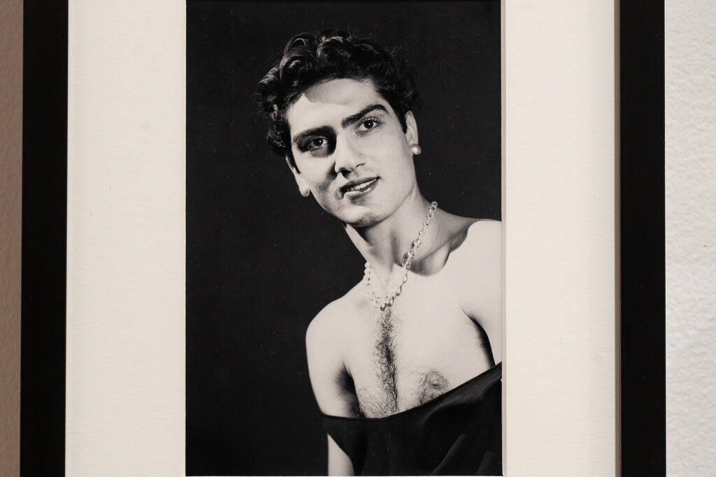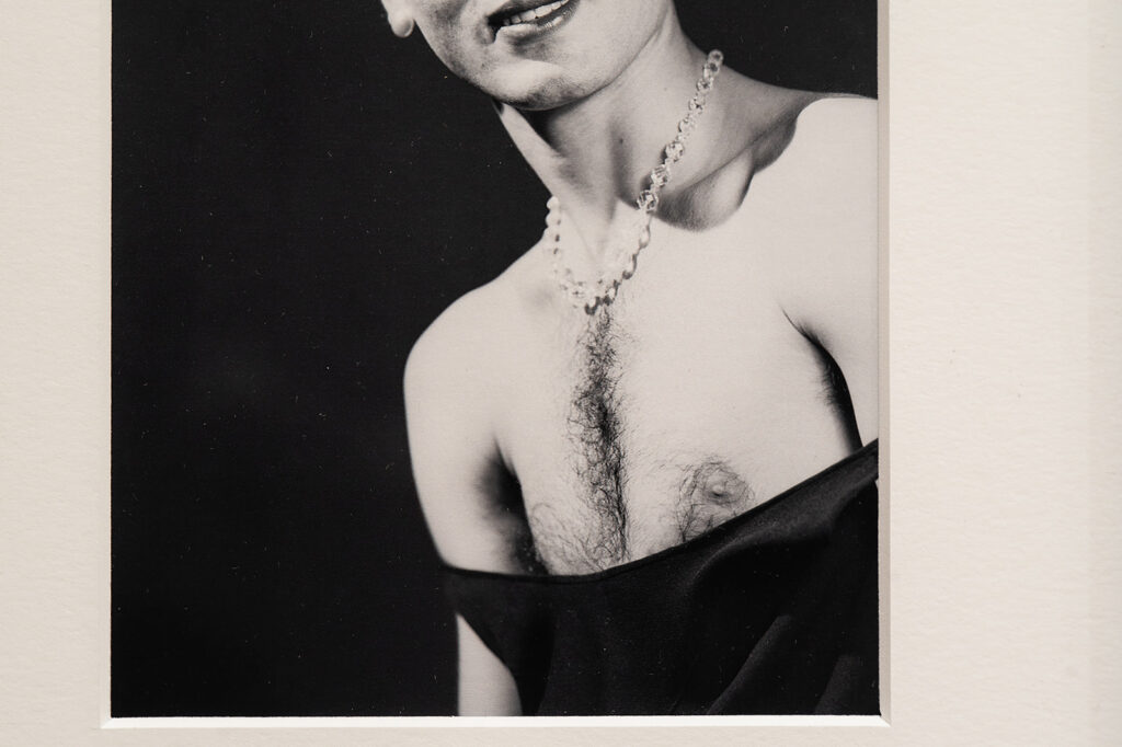 In his cross-dressing Self Portrait, Van Leo adorns an outfit reminiscent of a Hollywood star: an alluring off the shoulder dress completed with a set of dazzling accessories. Although aiming to resemble a female movie star, the low neckline of the garment reveals Van Leo’s flat chest and body hair amongst other clues to his own physicality. These intentionally untouched attributes ground his identity in the corporal gender playground, guiding him to slip into and shed the characters while avowing his masculinity. Here, gendered dress becomes Van Leo’s tool to a nuanced exploration of gender.
