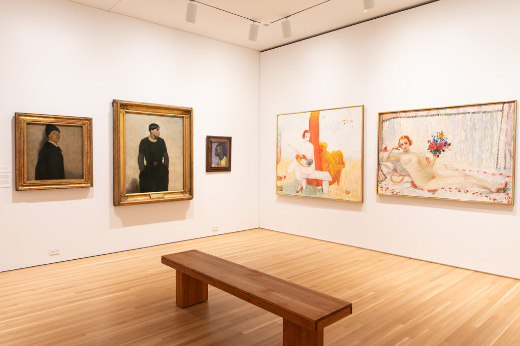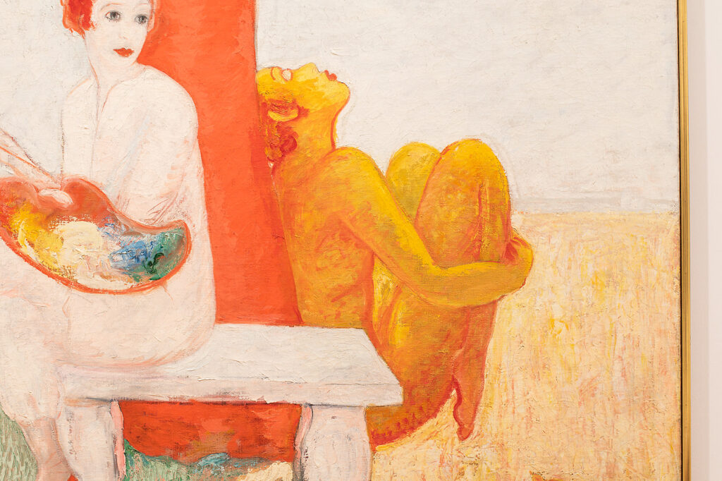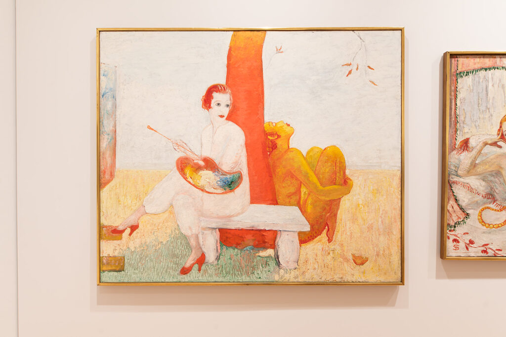While the exact date of the painting is unknown, this lens adds rich context to Florine Stettheimer’s Self‐Portrait with Palette (Painter and Faun). Here, Stettheimer puts herself in opposition to a faun, who is given a more serene and idealistic attitude. With his eyes closed and head cast towards the sky, the creature seems capable of perception without sight. However, the faun’s hallmark flamboyance is maintained through a vibrant red color. The warm hues of the tree extend to the nude figure, both contrasting Stettheimer’s white outfit and pale complexion.